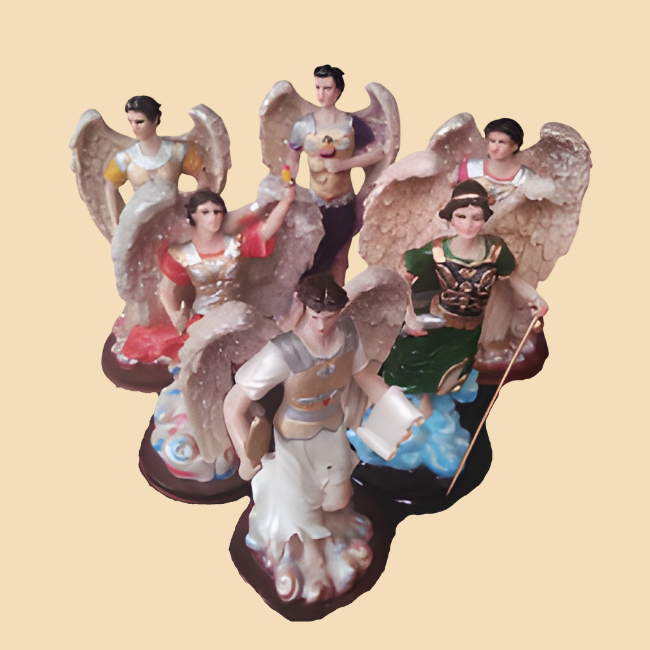 Estos majestuosos arcángeles, esculpidos en resina, fabricados por artesanos mexicanos, son una representación tangible de la protección y guía divina.
